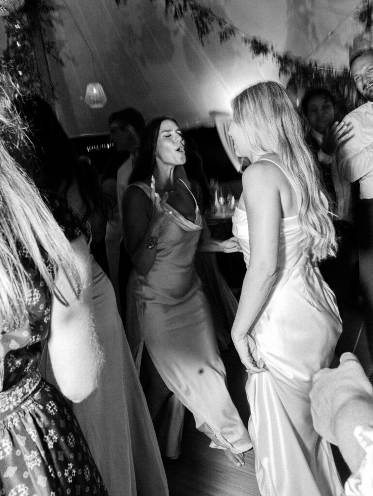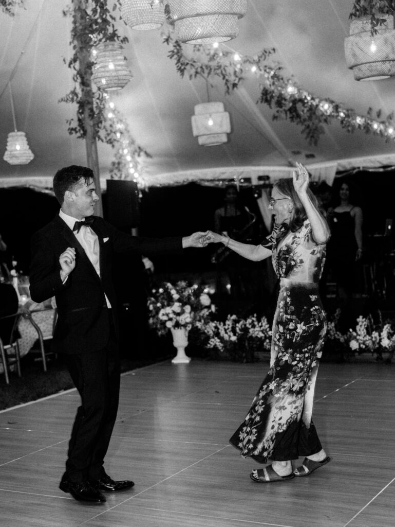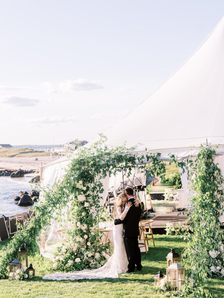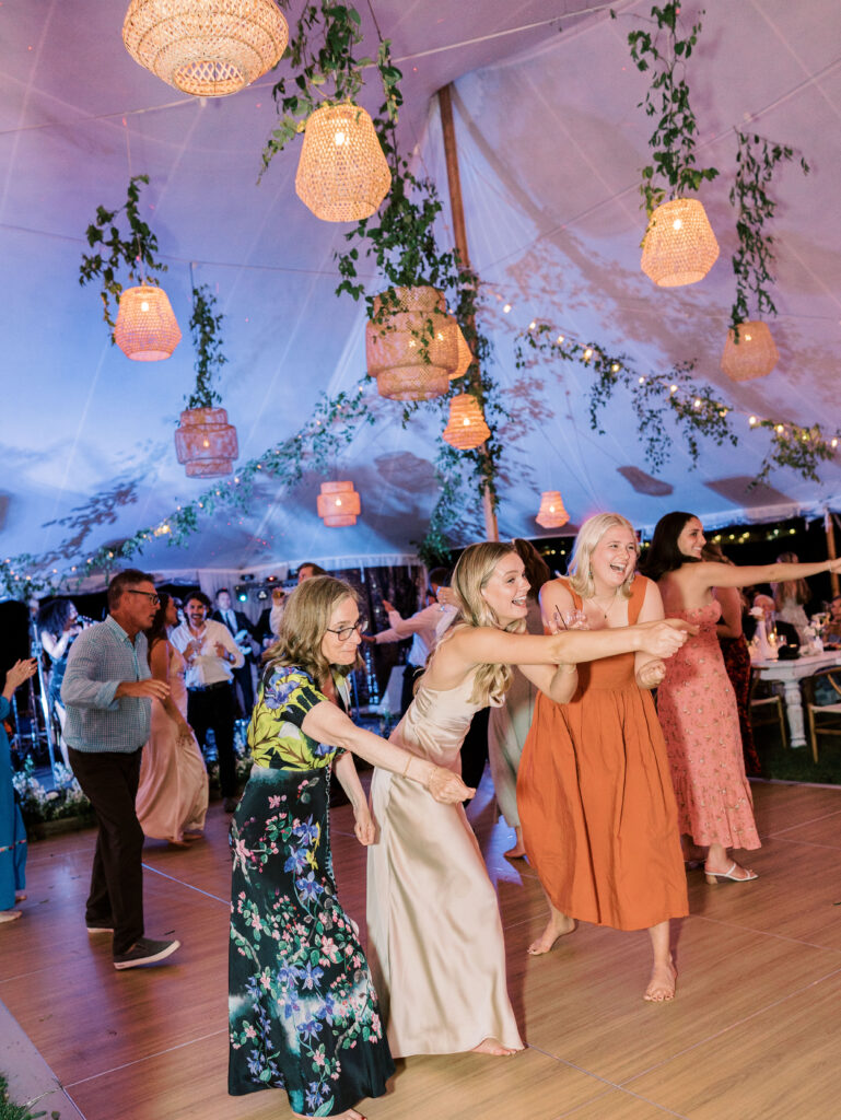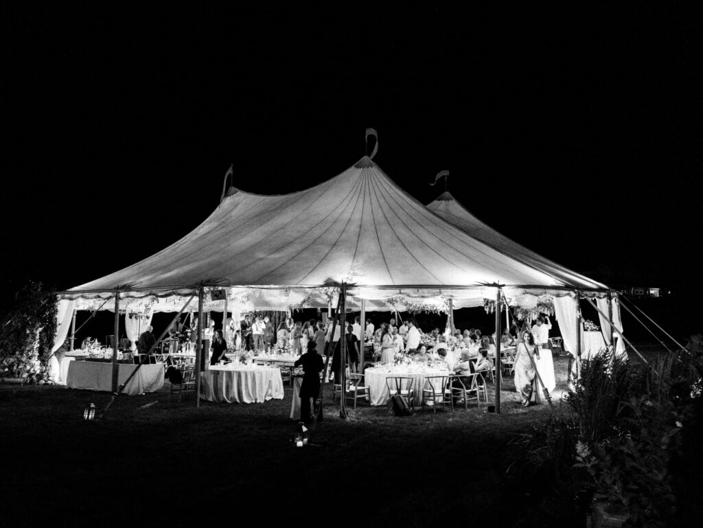 Cocktail hour was alive with music and conversation as Nicole and Ellery slipped away for a private first dance inside their beautifully decorated reception tent. When guests entered, the tent glowed with soft lighting, romantic florals, and a design that felt as warm as it was refined. The evening seamlessly shifted from tender, intimate exchanges to the joyful energy of a packed dance floor.